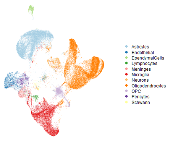 Die räumliche Transkriptomik von menschlichen Rückenmarksproben identifiziert alle zu erwartenden Zelltypen des zentralen Nervensystems auf der Grundlage von Genexpressionsprofilen von 266 Genen. Jeder Punkt repräsentiert eine einzelne Zelle. Die Proben umfassen sowohl gesunde Spender als auch Menschen mit ALS.