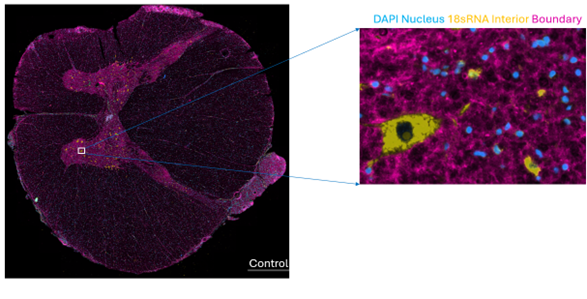 Das ist ein repräsentativer Querschnitt von dem menschlichen Rückenmark, der mit Xenium-räumlicher Transkriptomik analysiert wurde. Das nicht-dissoziative Protokoll erhaltet Gewebearchitektur und seltene Zellentypen, worunter Motorneuronen (siehe eingezoomter Einsatz). Die Färbungen wurden wiedergegeben, wie angewiesen.