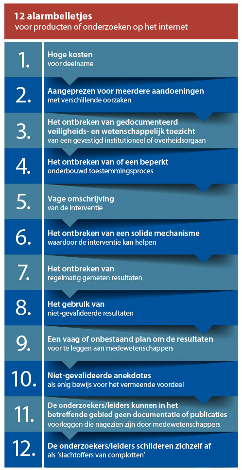 Bedlack zegt dat het nuttig is met patiënten de volgende lijst van alarmbelletjes te delen die hij publiceerde via ALSUntangled. De alarmbelletjes waarschuwen voor bepaalde producten of onderzoeken die de patiënten online tegenkomen. “Een arts zou aan de hand van deze alarmbelletjes kunnen nagaan in welke mate een product of onderzoek betrouwbaar is. Als er veel alarmbelletjes afgaan, is het volgens hem of haar dan misschien tijd om naar iets anders over te schakelen. We moeten een manier bedenken om optimistisch te zijn, de ideeën van onze patiënten te respecteren en hun vragen te beantwoorden. Als we als we onze jarenlange wetenschappelijke opleiding inzetten om hen te helpen, denk ik dat we ze meer gerichte en betere beslissingen kunnen nemen over de internetproducten die ze tegenkomen.”